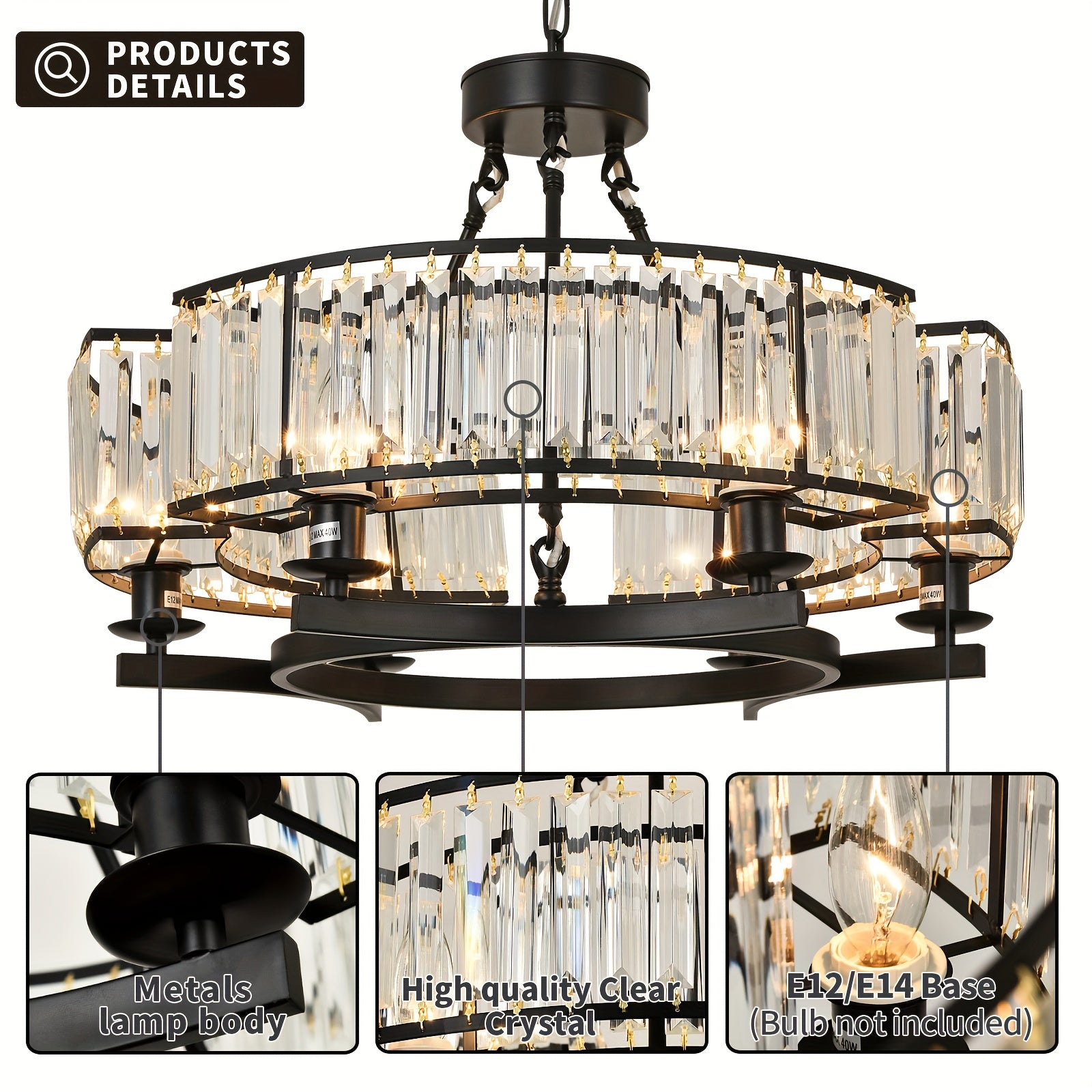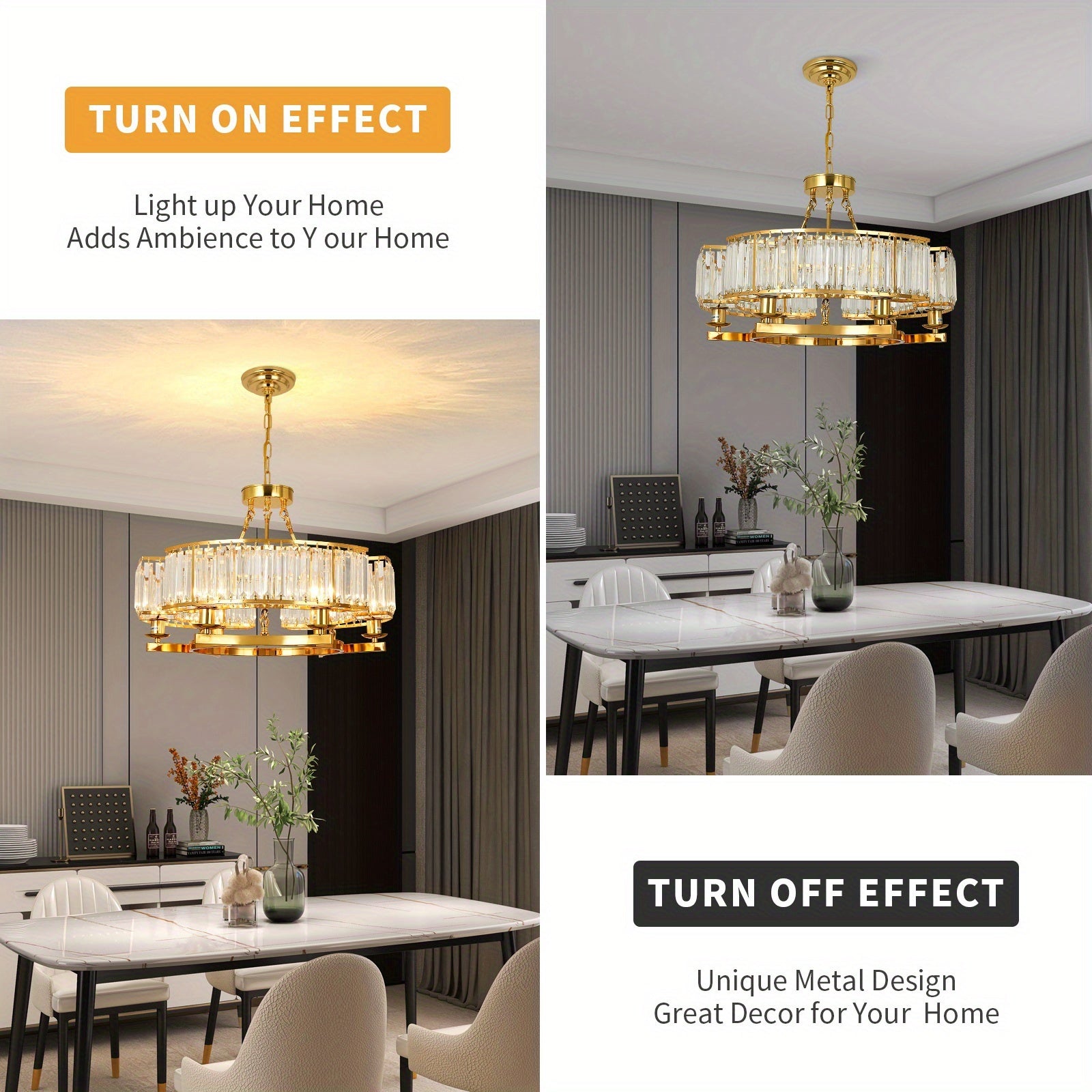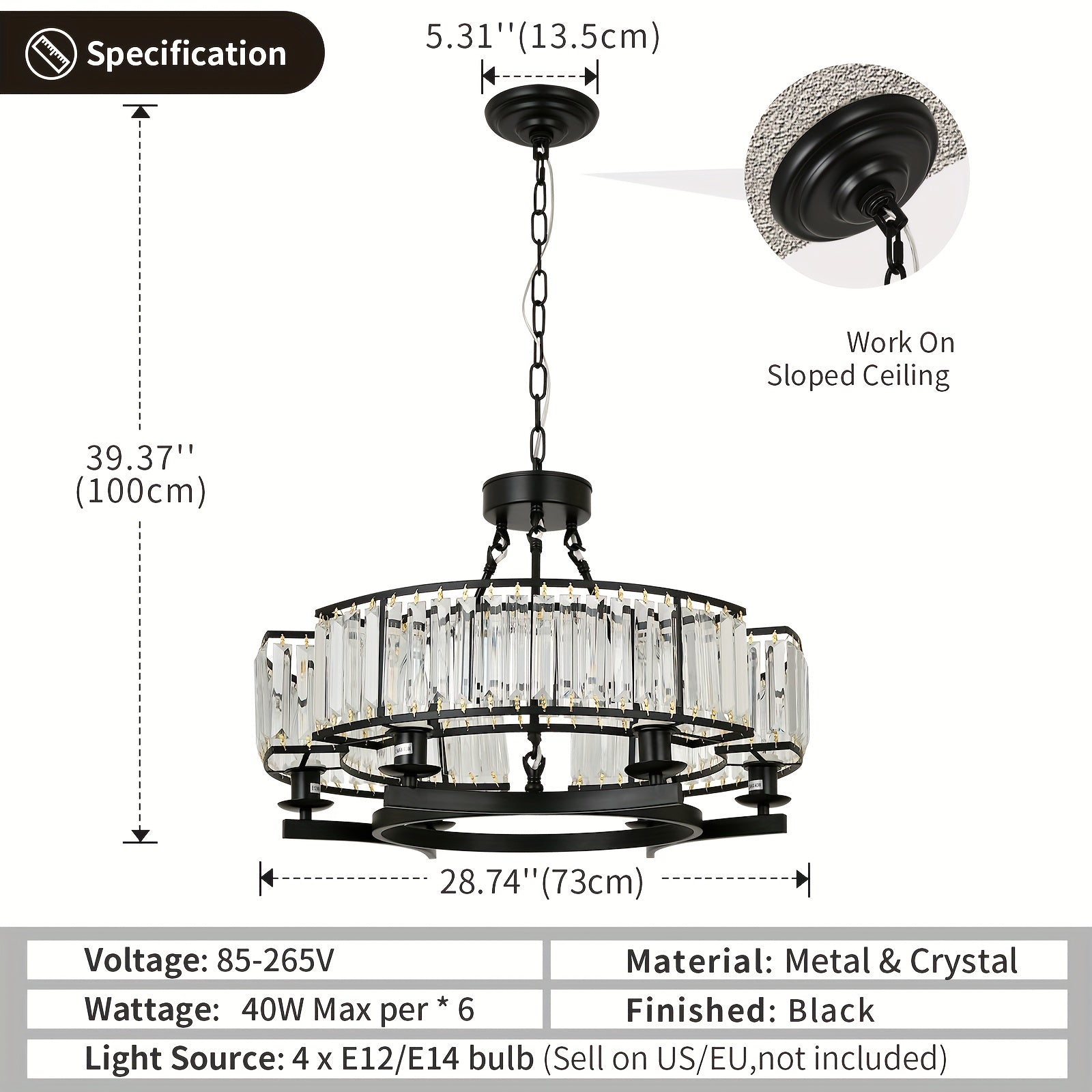 Modern Crystal Chandelier Gold/Black Lighting FixtureSpecification:Style: ModernProduct shape: round.Product dimensions: diameter: 55 cm.Total height: 60 to 100 cm including chain.Frame finished: GoldMaterial: stainless steel and crystal.Power type: AC.Voltage: 110V.Socket: 6 x E12 bulb base, max 40 W per bulb, compatible with LED, CFL (bulbs are not included).Wide range of uses:The luxurious crystal pendant light meets various modern decoration styles, such as dining roo