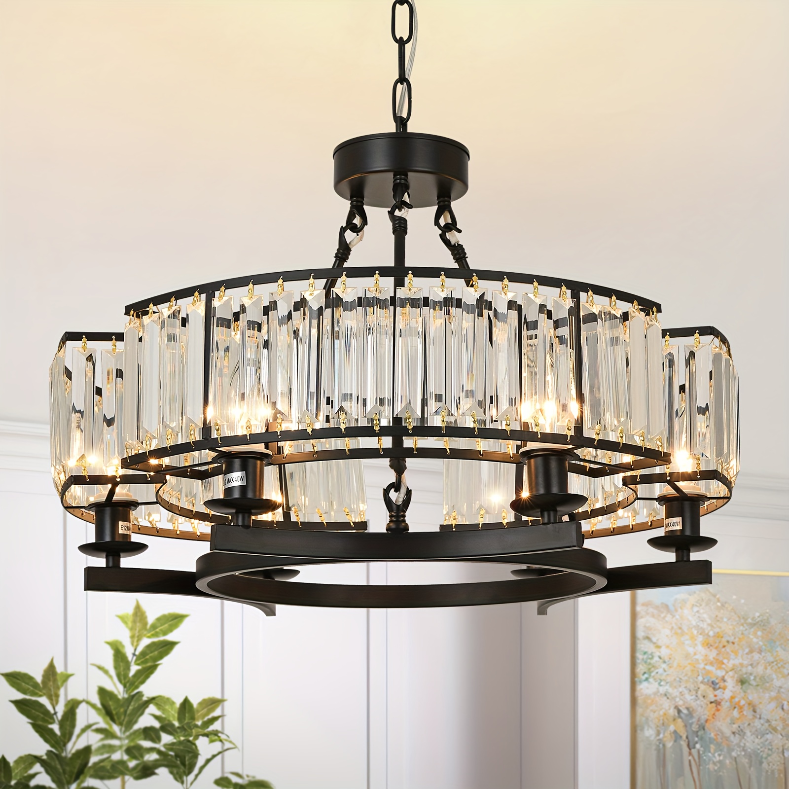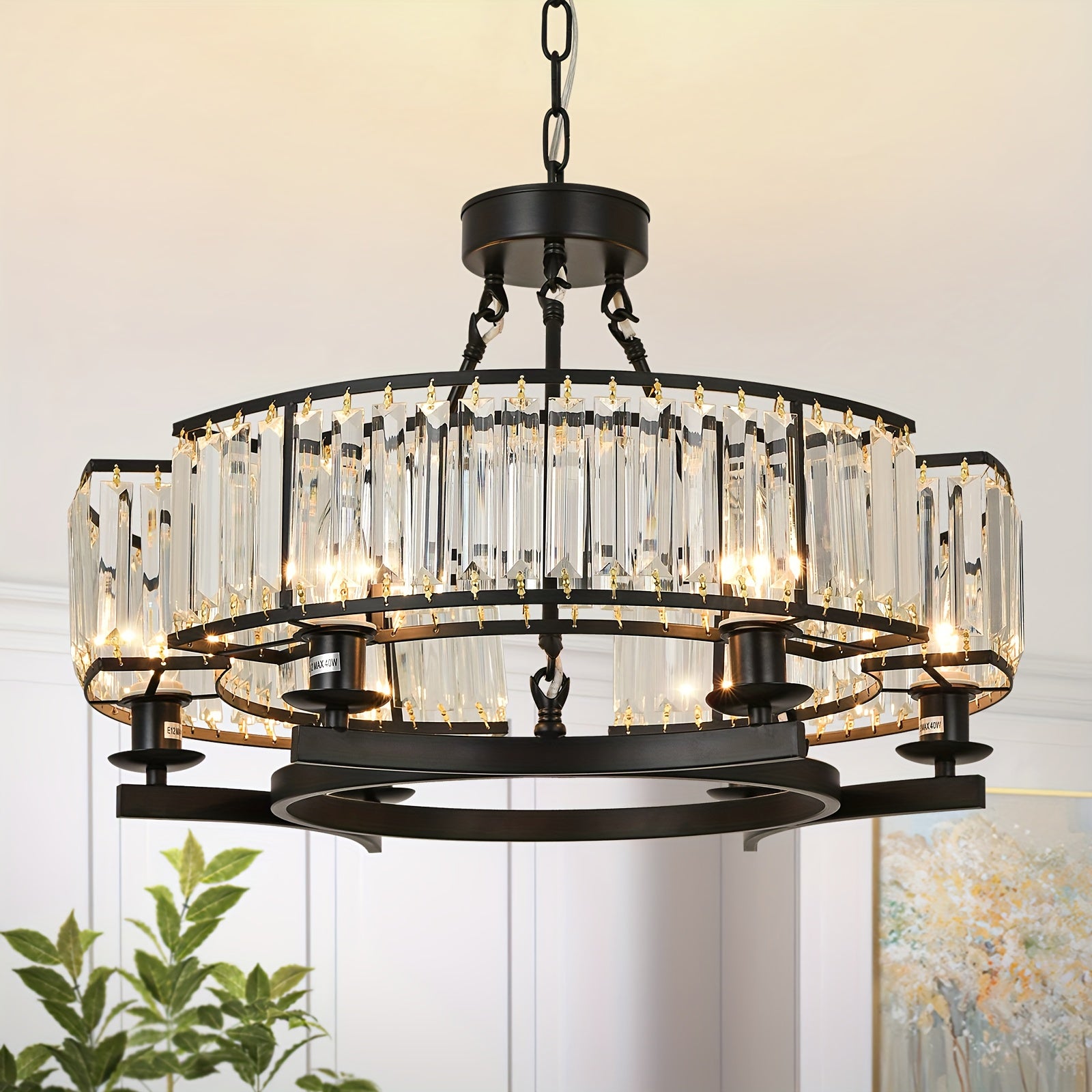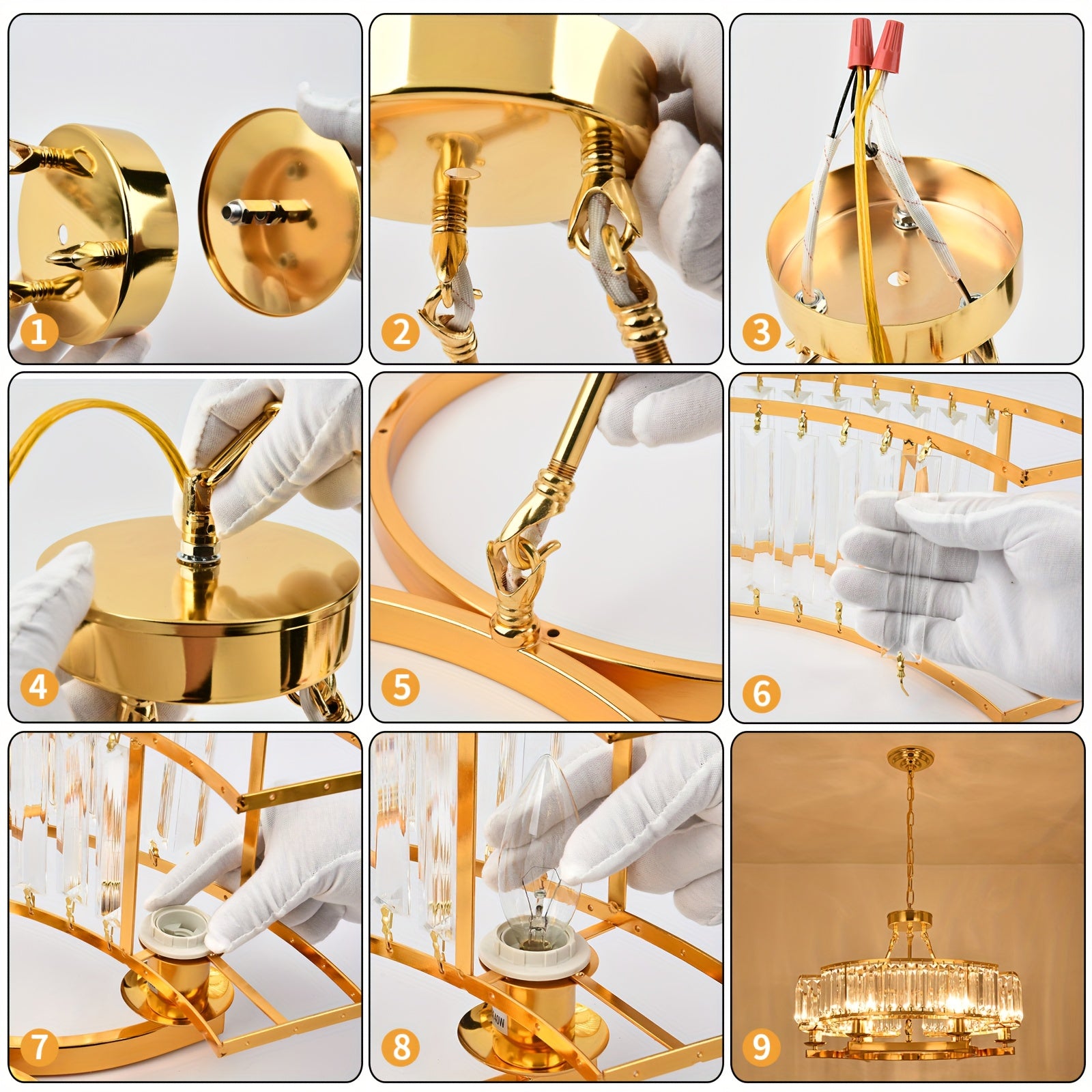 Modern Crystal Chandelier Gold/Black Lighting FixtureSpecification:Style: ModernProduct shape: round.Product dimensions: diameter: 55 cm.Total height: 60 to 100 cm including chain.Frame finished: GoldMaterial: stainless steel and crystal.Power type: AC.Voltage: 110V.Socket: 6 x E12 bulb base, max 40 W per bulb, compatible with LED, CFL (bulbs are not included).Wide range of uses:The luxurious crystal pendant light meets various modern decoration styles, such as dining roo